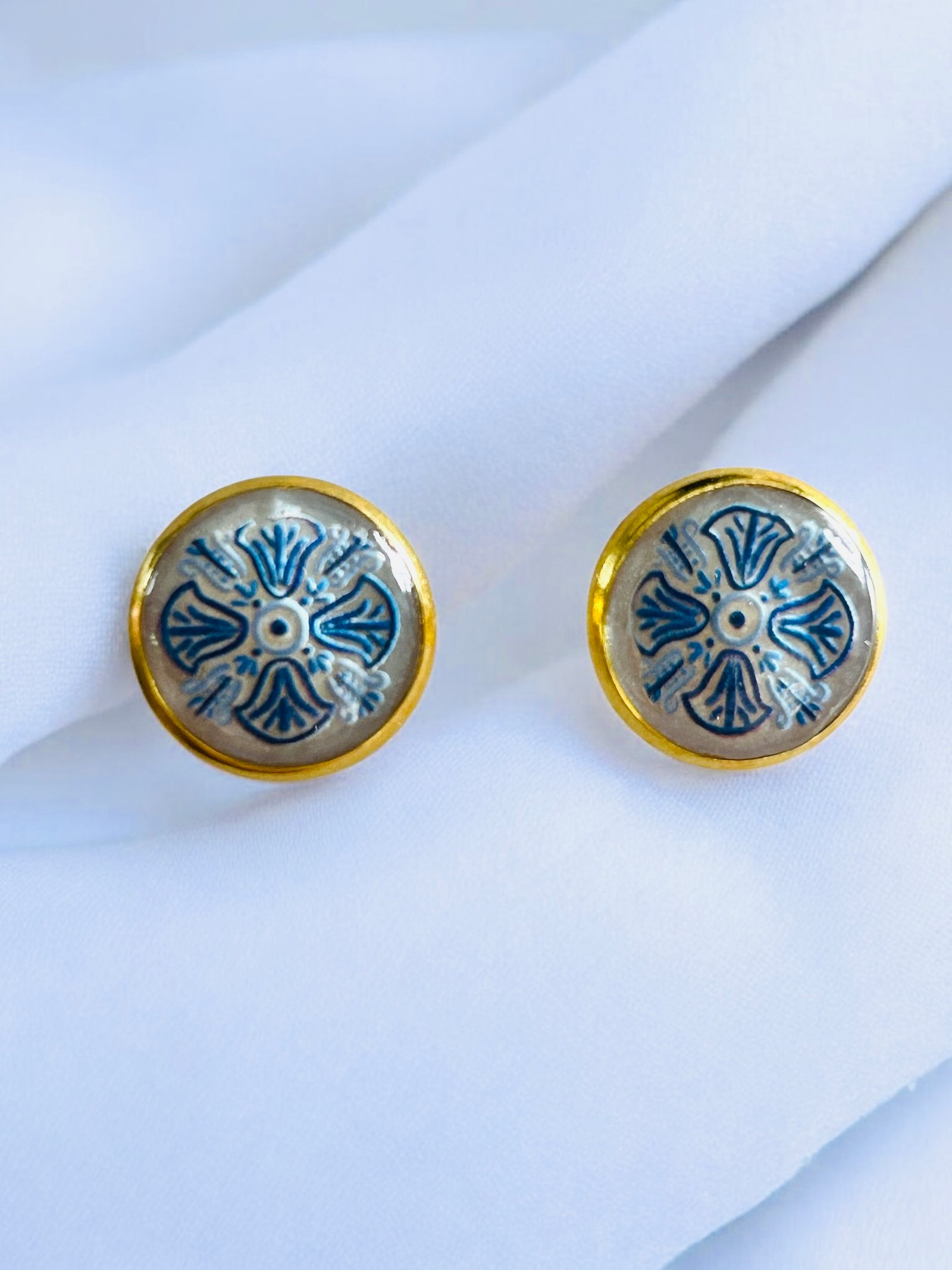 Boucles d’oreilles puces en forme de rond, motif mosaique, couleur bleu et blanc