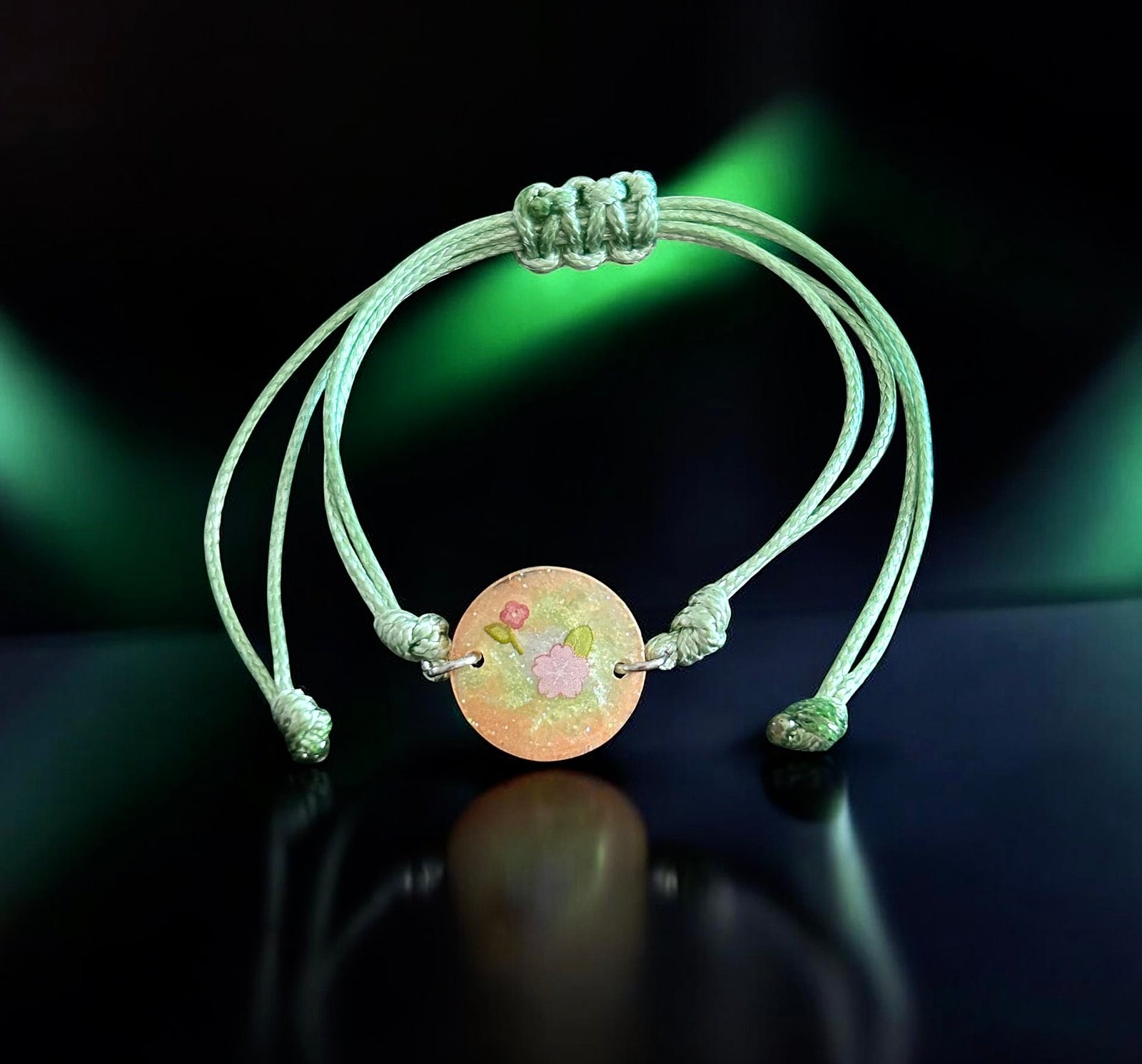 Bracelet enfant en forme de rond, motif fleur, couleur orange et jaune
