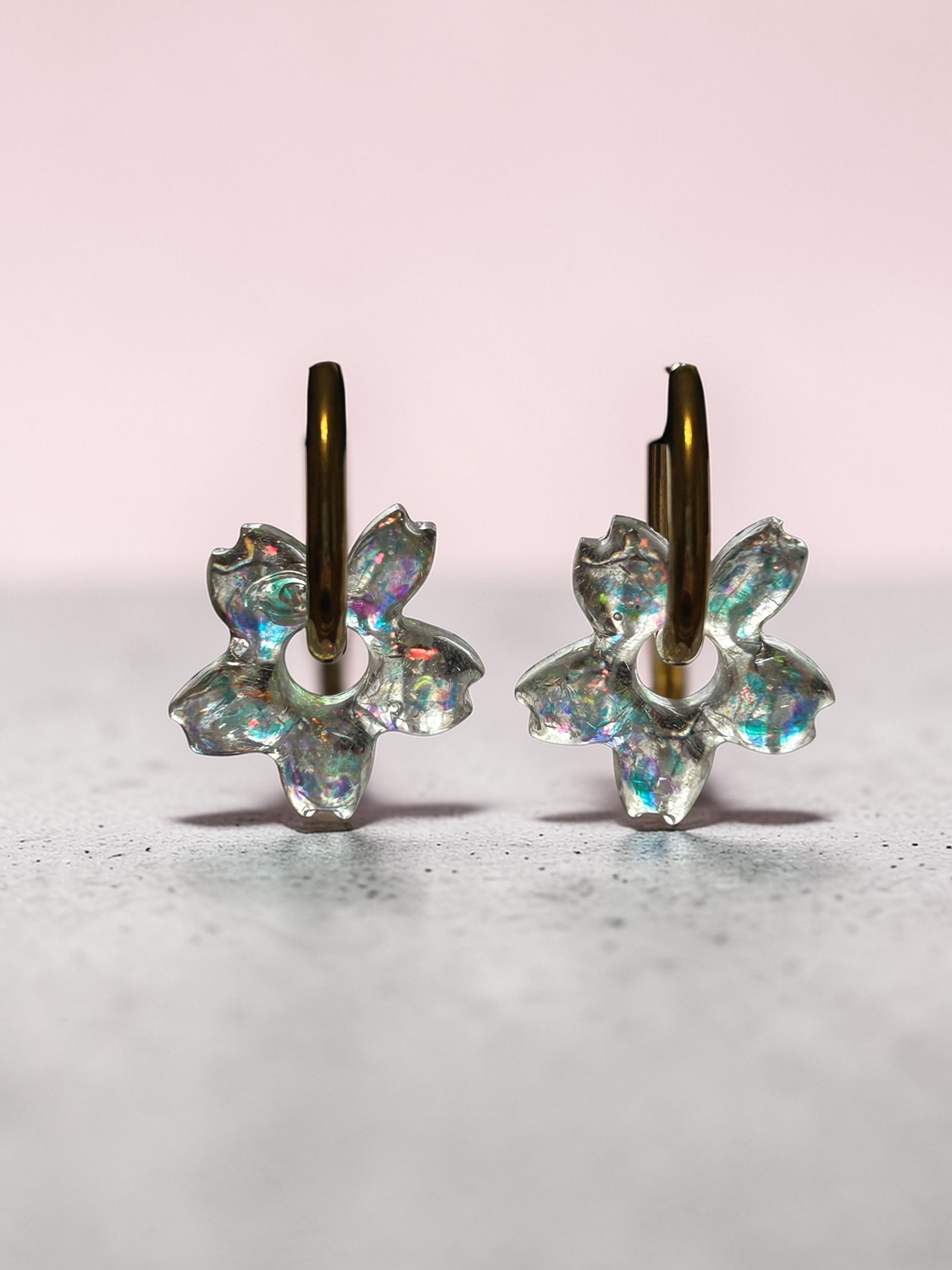 Pampilles mesurant 2 cm en forme de fleur, couleur transparent à paillettes holographiques