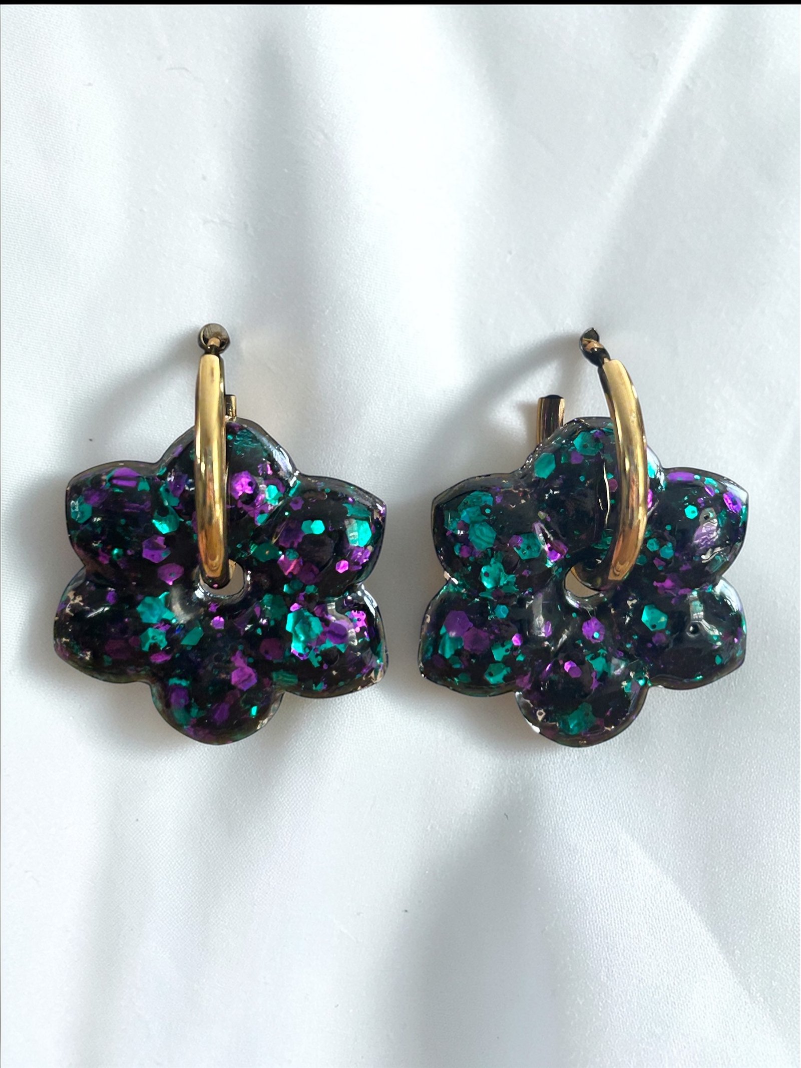 Pampilles mesurant 3 cm en forme de fleur, couleur noir, violet et vert