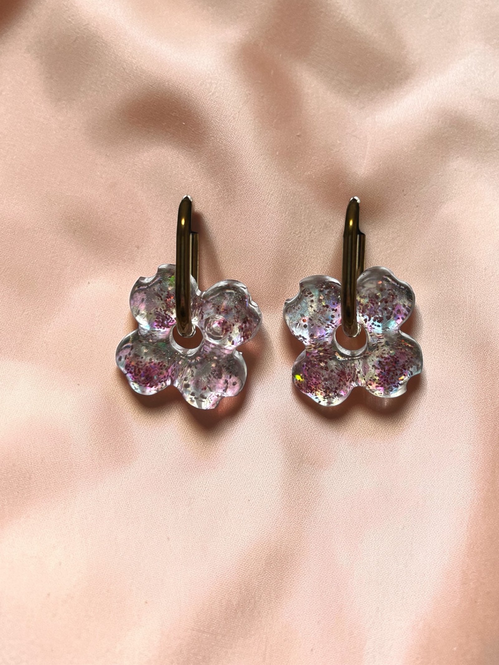 Pampilles mesurant 2 cm en forme de fleur, couleur pailleté holographique effet rose
