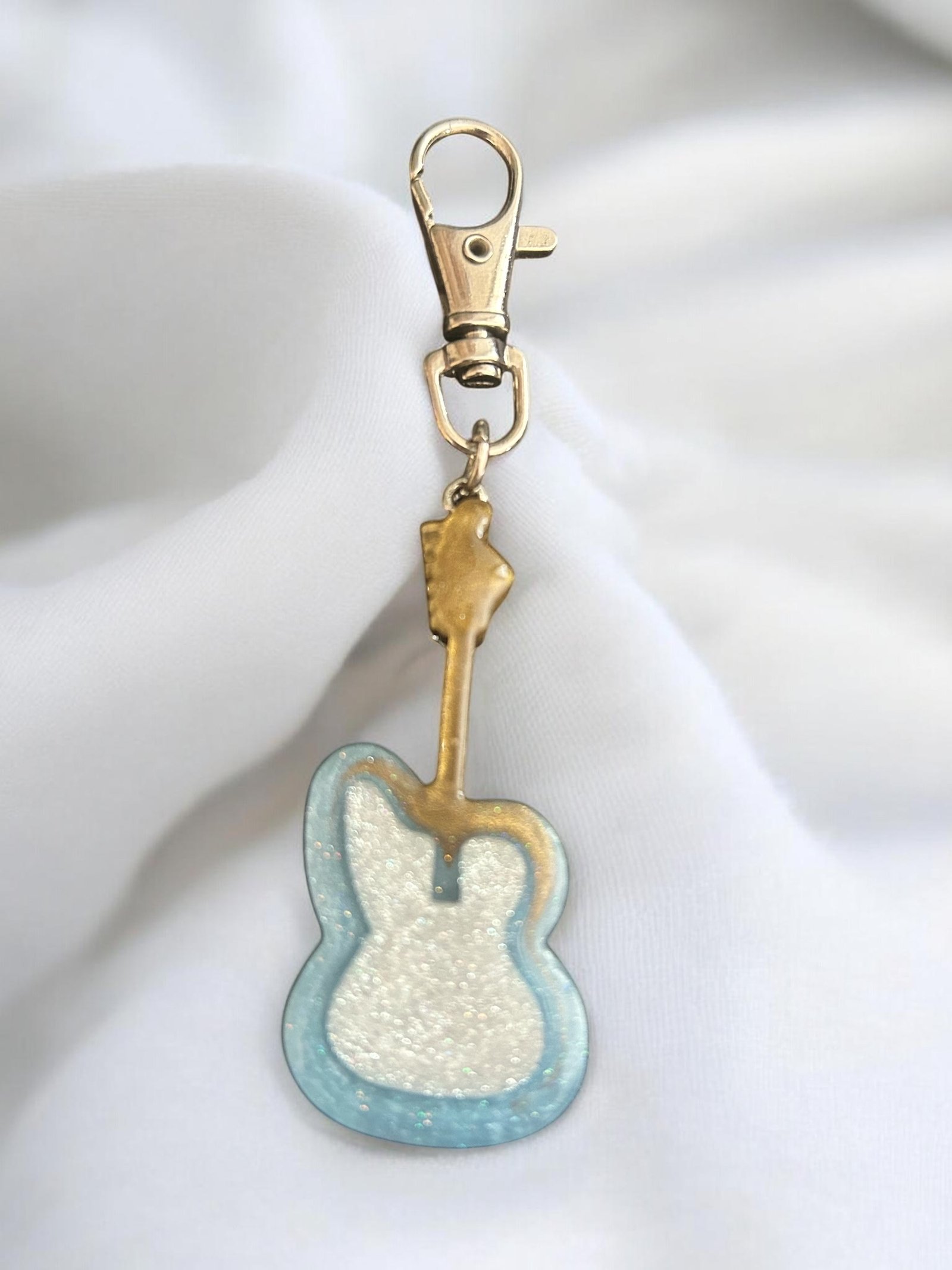 Porte clé en forme de guitare, couleur blanc, bleu, doré